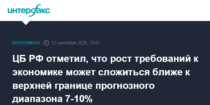 ЦБ РФ отметил, что рост требований к экономике может сложиться ближе к верхней границе прогнозного диапазона 7-10%