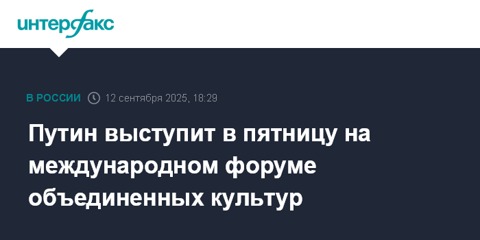 Москва. 12 сентября. INTERFAX.RU - Президент РФ Владимир Путин в пятницу в Санкт-Петербурге выступит на международном форуме объединенных культур и пообщается с министром культуры РФ Ольгой Любимовой, сообщил пресс-секретарь главы государства Дмитрий Песков.