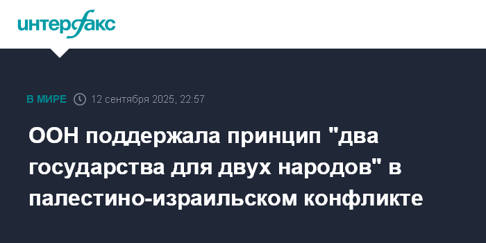 Москва. 12 сентября. INTERFAX.RU - Генассамблея ООН одобрила резолюцию, которая предусматривает урегулирование палестино-израильского конфликта по принципу "два государства для двух народов", сообщает в пятницу пресс-служба Организации.