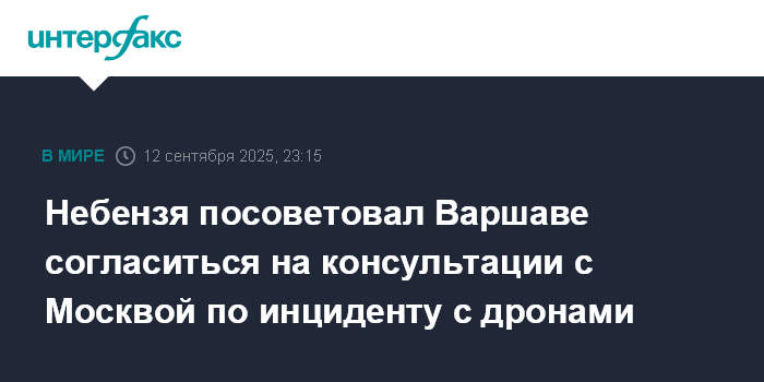 Москва. 12 сентября. INTERFAX.RU - Польской стороне, если она заинтересована в деэскалации, следует принять предложение Москвы о консультациях по поводу недавнего инцидента с дронами, обнаруженными над территорией Польши, заявил в пятницу постпред РФ при ООН Василий Небензя.