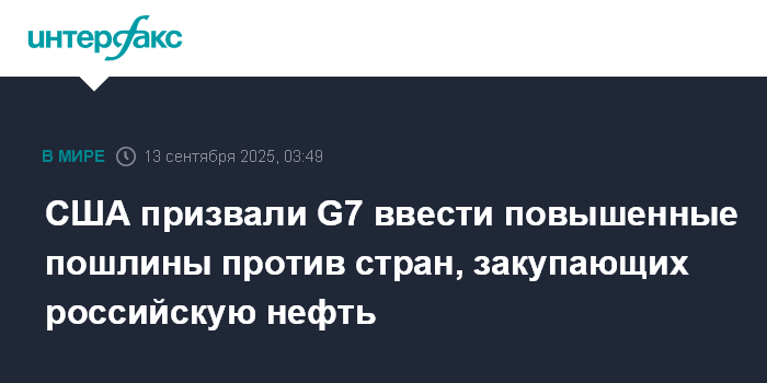 Москва. 13 сентября. INTERFAX.RU - Министр финансов США Скотт Бессент призвал страны "большой семерки" присоединиться к США в введении пошлин в отношении государств, закупающих нефть у России, сообщил американский Минфин.