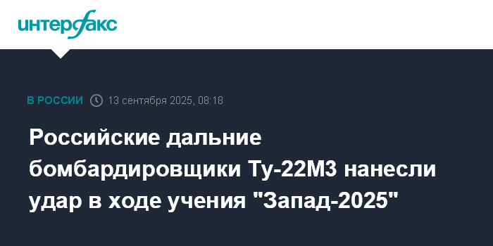 Российские дальние бомбардировщики Ту-22М3 нанесли удар в ходе учения "Запад-2025"