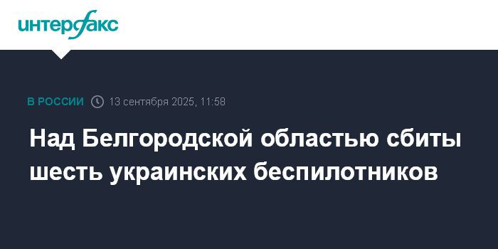 Москва. 13 сентября. INTERFAX.RU - Российские средства ПВО с 08:00 до 10:00 мск субботы уничтожили шесть украинских БПЛА самолетного типа над территорией Белгородской области, сообщает Минобороны РФ.