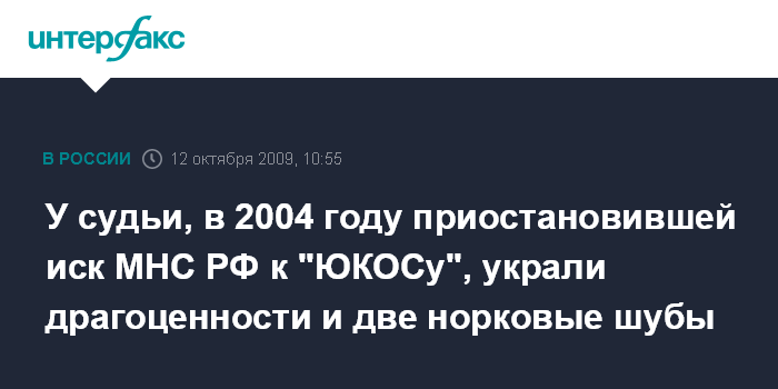 У судьи, в 2004 году приостановившей иск МНС РФ к "ЮКОСу", украли драгоценности и две норковые шубы
