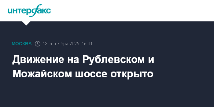 Москва. 13 сентября. INTERFAX.RU - Столичный департамент транспорта сообщил в своем телеграм-канале об открытии движения на Рублевском и Можайском шоссе после временного закрытия.
