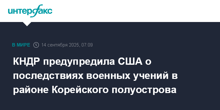 Москва. 14 сентября. INTERFAX.RU - В КНДР считают, что демонстрация силы посредством проведения в районе Корейского полуострова совместных военных учений Южной Кореи, Японии и США угрожает безопасности в регионе и приведет к негативным последствиям, сообщает Центральное телеграфное агентство Кореи.