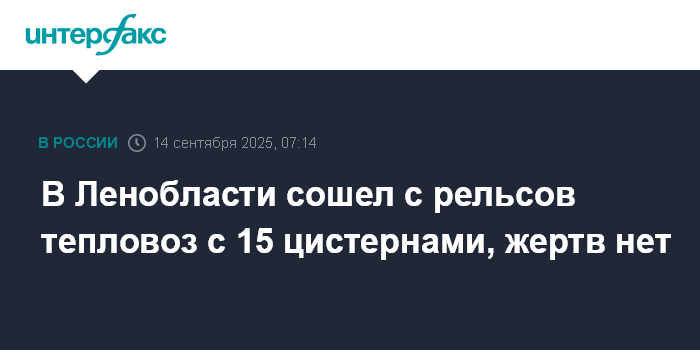 Москва. 14 сентября. INTERFAX.RU - В Лужском районе Ленинградской области сошел с рельсов тепловоз с 15 порожними цистернами, жертв нет, сообщил глава региона Александр Дрозденко.