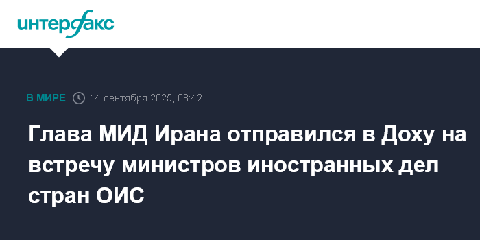 Москва. 14 сентября. INTERFAX.RU - Министр иностранных дел Ирана Аббас Аракчи в воскресенье утром отбыл в Доху для участия в экстренной встрече глав внешнеполитических ведомств стран Организации исламского сотрудничества (ОИС), созванной по просьбе Катара, сообщает иранское агентство Mehr.