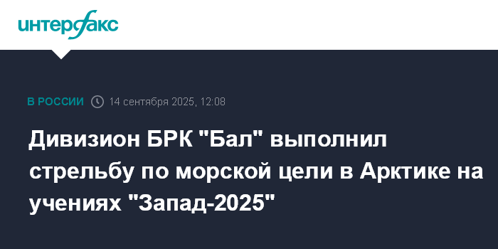 Москва. 14 сентября. INTERFAX.RU - Стрельбу по морской цели выполнил в Арктике расчет берегового ракетного комплекса (БРК) "Бал" на стратегических учениях "Запад-2025", сообщило в воскресенье Минобороны РФ.