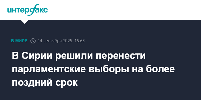 Москва. 14 сентября. INTERFAX.RU - Власти Сирии перенесли на более поздний срок парламентские выборы, планировавшиеся первоначально на 15-20 сентября, так как не завершили некоторые подготовительные мероприятия, сообщает в воскресенье агентство EFE со ссылкой на представителя сирийского избиркома Навара Наджмеха.