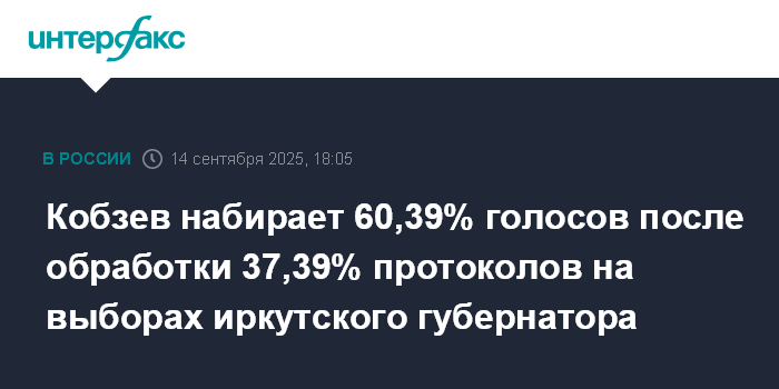Москва. 14 сентября. INTERFAX.RU - По результатам обработки 37,39% протоколов на выборах губернатора Иркутской области продолжает лидировать действующий глава региона Игорь Кобзев с 60,39% голосов. Соответствующая информация размещена на онлайн-табло ЦИК РФ.