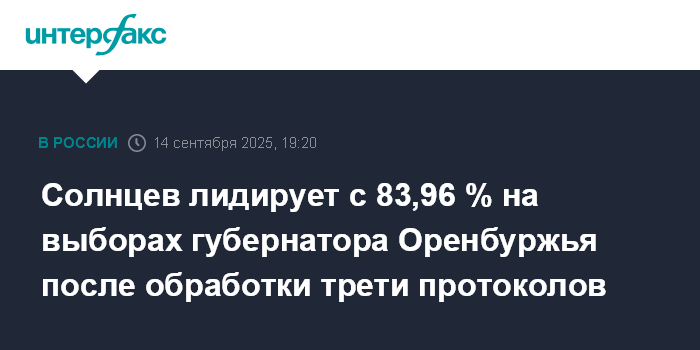 Солнцев лидирует с 83,96 % на выборах губернатора Оренбуржья после обработки трети протоколов