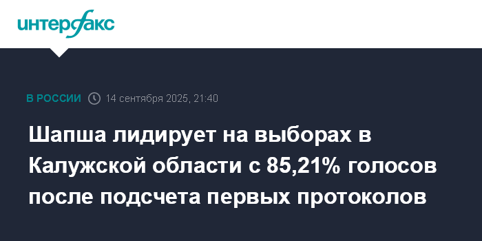 Москва. 14 сентября. INTERFAX.RU - Действующий глава Калужской области Владислав Шапша (от партии "Единая Россия") лидирует на выборах губернатора региона с 85,21% голосов по итогам обработки 0,28% протоколов, следует из данных ЦИК РФ.