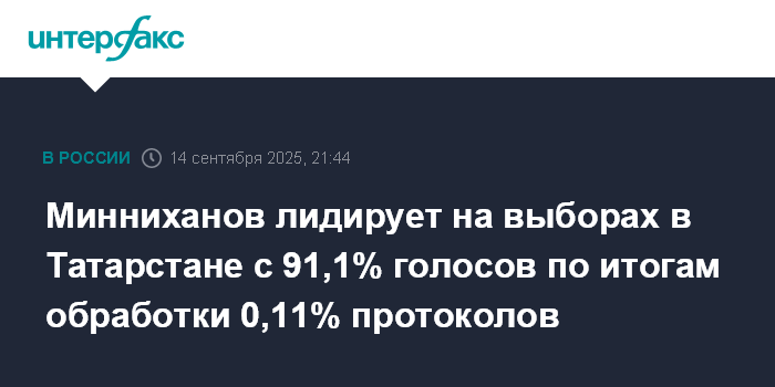 Москва. 14 сентября. INTERFAX.RU - Действующий глава Татарстана Рустам Минниханов (от партии "Единая Россия") лидирует на выборах губернатора региона с 91,1% голосов по итогам обработки 0,11% протоколов, следует из данных ЦИК РФ.