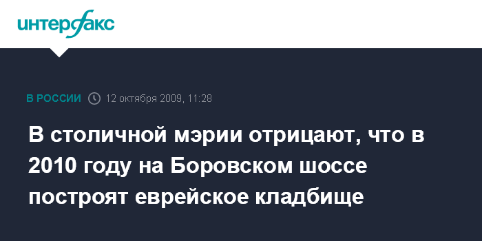 Так он прокомментировал появившуюся в минувшую пятницу информацию о том, что власти Москвы за счет горбюджета построят до 31 декабря 2010 года еврейское кладбище на Боровском шоссе (Проектируемый проезд, 634).