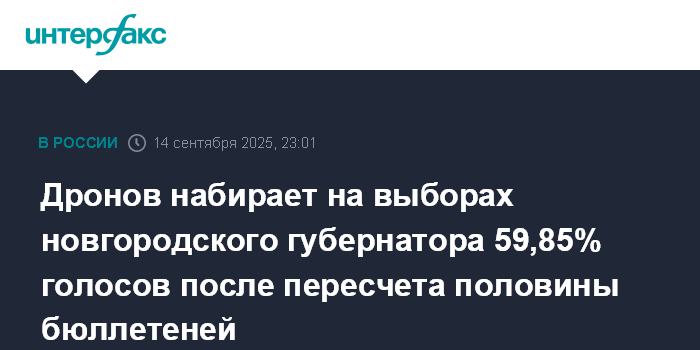 Дронов набирает на выборах новгородского губернатора 59,85% голосов после пересчета половины бюллетеней