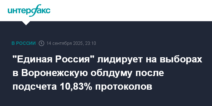 Москва. 14 сентября. INTERFAX.RU - Партия "Единая Россия" сохраняет лидерство на выборах депутатов Воронежской областной думы по итогам обработки 10,83% протоколов, следует из данных ЦИК РФ.