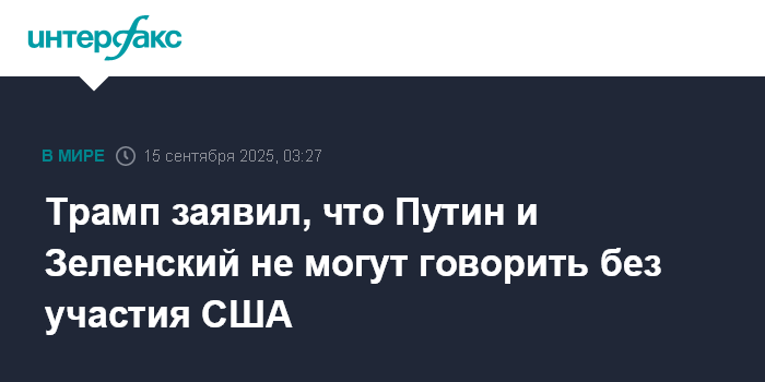 Москва. 15 сентября. INTERFAX.RU - Президент США Дональд Трамп не исключил, что переговоры российского лидера Владимира Путина и президента Украины Владимира Зеленского пройдут "относительно скоро" с американским участием.