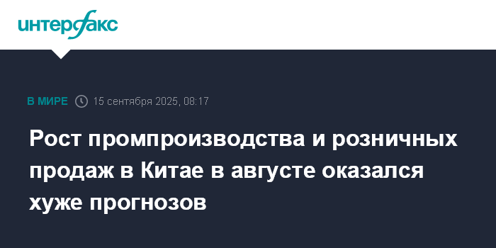 Рост промпроизводства и розничных продаж в Китае в августе оказался хуже прогнозов