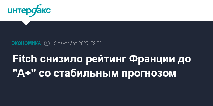 Москва. 15 сентября. INTERFAX.RU - Агентство Fitch Ratings снизило кредитный рейтинг Франции до "A+" с "AA-" на фоне политической нестабильности и растущего госдолга страны.