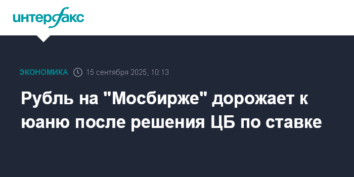Москва. 15 сентября. INTERFAX.RU - Утром в понедельник на "Московской бирже" рубль дорожает к юаню на решении Банка России по ключевой ставке и корректируется вверх после падения значительную часть прошлой недели.