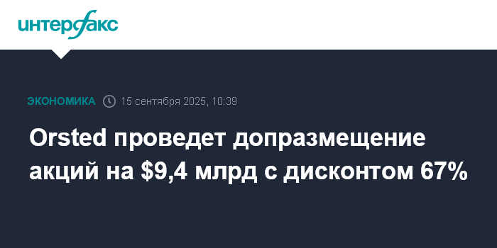 Москва. 15 сентября. INTERFAX.RU - Датская Orsted A/S, крупнейший в мире оператор ветропарков, планирует разместить новые акции на сумму 60 млрд датских крон ($9,4 млрд), причем со значительным дисконтом. Об этом сообщила сама компания.