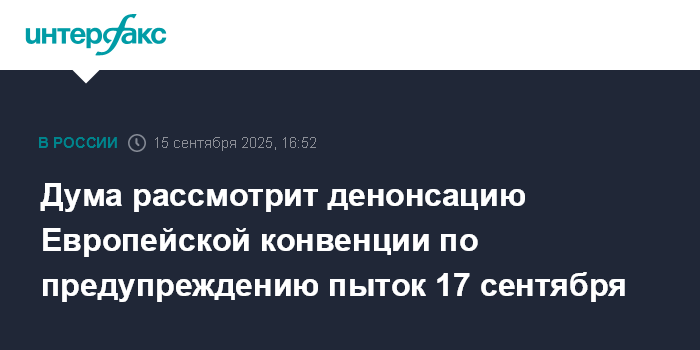 Москва. 15 сентября. INTERFAX.RU - Совет Думы утвердил 17 сентября датой рассмотрения законопроекта о денонсации Российской Федерацией Европейской конвенции по предупреждению пыток и бесчеловечного или унижающего достоинство обращения или наказания и протоколов к ней, сообщил председатель Госдумы Вячеслав Володин.