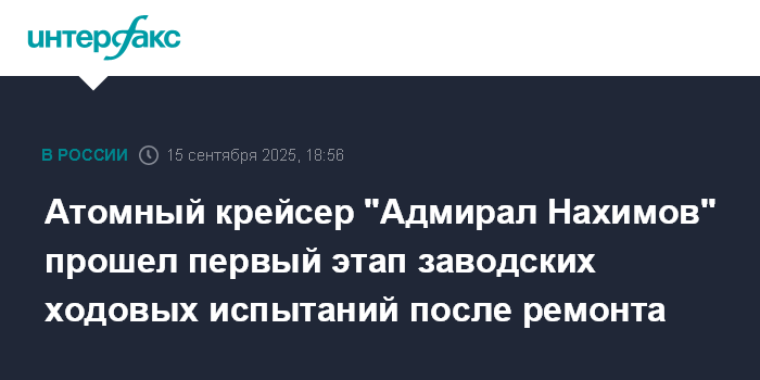 Москва. 15 сентября. INTERFAX.RU - Тяжёлый атомный ракетный крейсер "Адмирал Нахимов", проходящий модернизацию и ремонт на "Севмаше", успешно завершил первый этап заводских ходовых испытаний в море и прибыл к штатному причалу завода, сообщили в Минобороны России в понедельник.