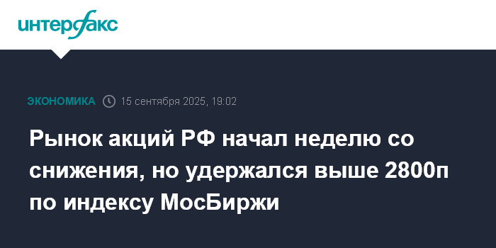 Москва. 15 сентября. INTERFAX.RU - Рынок акций РФ начал неделю со снижения, которое вечером было сглажено за счет закрытия игроками части коротких позиций после распродаж на умеренном смягчении монетарной политики ЦБ РФ, на фоне рисков новых антироссийских санкций Запада и сохраняющейся геополитической напряженности, сдерживающим фактором выступила подорожавшая нефть (фьючерс на Brent подрос к $67,4 за баррель). Индекс МосБиржи в течение торгов опускался к 2800 пунктам (минимум с 6 августа), но к закрытию отскочил в район 2810 пунктов.