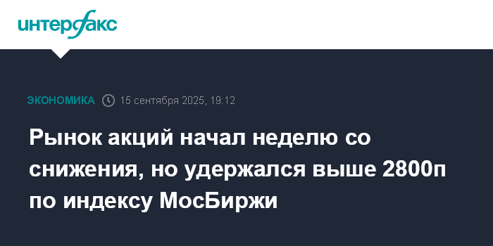 Москва. 15 сентября. INTERFAX.RU - Рынок акций РФ начал неделю со снижения, которое вечером было сглажено за счет закрытия игроками части коротких позиций после распродаж на умеренном смягчении монетарной политики ЦБ РФ, на фоне рисков новых антироссийских санкций Запада и сохраняющейся геополитической напряженности, сдерживающим фактором выступила подорожавшая нефть (фьючерс на Brent подрос к $67,4 за баррель). Индекс МосБиржи в течение торгов опускался к 2800 пунктам (минимум с 6 августа), но к закрытию отскочил в район 2810 пунктов.
