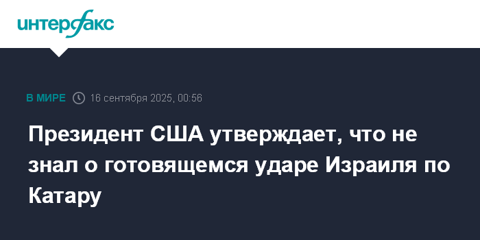 Москва. 16 сентября. INTERFAX.RU - Президент США Дональд Трамп заявил, что узнал об ударе Израиля по Катару лишь постфактум.