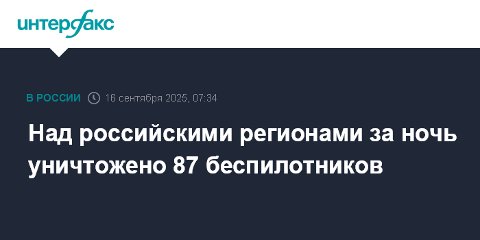 Москва. 16 сентября. INTERFAX.RU - Минобороны РФ сообщило, что в течение прошедшей ночи дежурными средствами ПВО перехвачено и уничтожено 87 украинских беспилотников самолетного типа над российскими регионами.