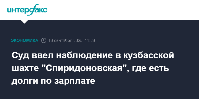 Москва. 16 сентября. INTERFAX.RU - Арбитражный суд Кемеровской области удовлетворил заявление ООО "Спутник" (Новосибирск) и ввёл процедуру наблюдения в отношении ООО "Шахта Спиридоновская" (Кемеровская область), прекратившего добычу угля с начала июня из-за отсутствия финансирования и имеющего долги по зарплате.