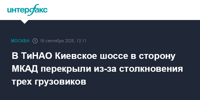 Москва. 16 сентября. INTERFAX.RU - В Новой Москве на Киевском шоссе у рабочего поселка Киевский столкнулись три грузовика, из-за этого остановлено движение в сторону МКАД, сообщили в Департаменте транспорта столицы.