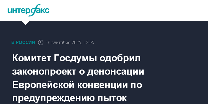 Москва. 16 сентября. INTERFAX.RU - Комитет Госдумы по международным делам рекомендовал денонсировать Европейскую конвенцию по предупреждению пыток и бесчеловечного или унижающего достоинство обращения или наказания и протоколов к ней, сообщил глава комитета Леонид Слуцкий.