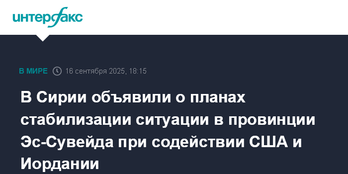 Москва. 16 сентября. INTERFAX.RU - Глава МИД Сирии Асаад аш-Шибани во вторник заявил, что Дамаск подготовил план, поддержанный США и Иорданией, по нормализации обстановки в провинции Эс-Сувейда на юге Сирии, населенной преимущественно друзами.