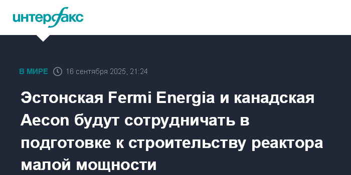 Москва. 16 сентября. INTERFAX.RU - Эстонская Fermi Energia AS подписала с канадской компанией Aecon соглашение о сотрудничестве в рамках проекта строительства в Эстонии малого модульного реактора BWRX-300, сообщает портал телерадиовещания ERR.