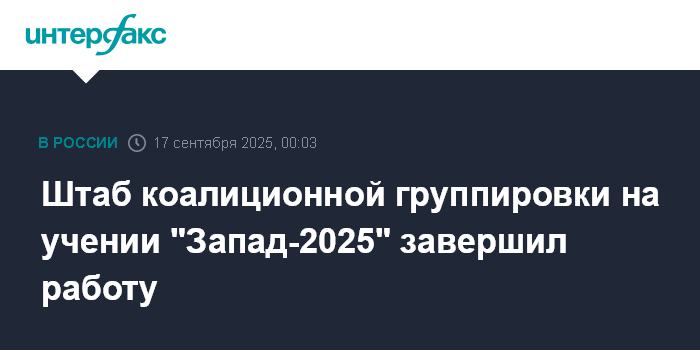 Москва. 17 сентября. INTERFAX.RU - После подведения итогов практических действий войск, принимавших участие в совместном стратегическом учении "Запад-2025" на полигоне "Мулино", завершил работу совместный штаб коалиционной группировки, сообщает Минобороны РФ во вторник.