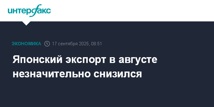 Москва. 17 сентября. INTERFAX.RU - Экспорт Японии в августе сократился на 0,1% относительно того же месяца прошлого года, сообщил японский Минфин.