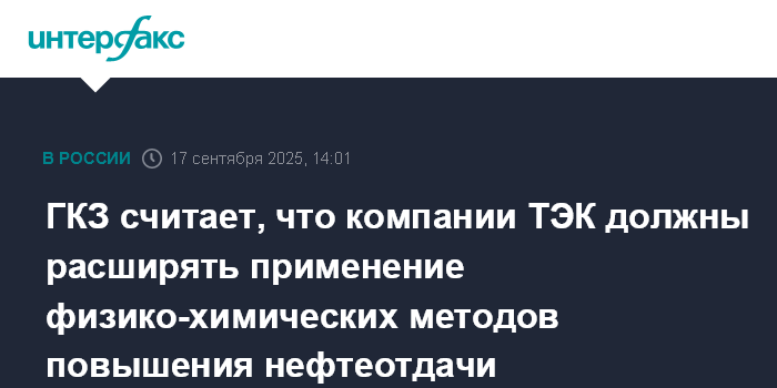 Москва. 17 сентября. INTERFAX.RU - Нефтегазовые компании уделяют недостаточно внимания физико-химическим методам повышения нефтеотдачи, сообщил генеральный директор ФБУ "Государственная комиссия по запасам полезных ископаемых" (ГКЗ) Игорь Шпуров в ходе Промышленно-энергетического форума TNF 2025 в Тюмени в среду.