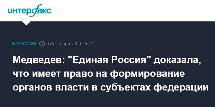Москва. 12 октября. INTERFAX.RU – Убедительная победа "Единой России" на местных выборах в целом ряде регионов РФ подтвердила авторитет этой партии и ее право на формирование органов исполнительной власти в регионах, считает президент РФ Дмитрий Медведев.