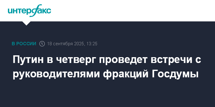 Москва. 18 сентября. INTERFAX.RU - Президент РФ Владимир Путин встретится в четверг с главами думских фракций, затем будет общаться с ними по отдельности, сообщил журналистам пресс-секретарь главы государства Дмитрий Песков.