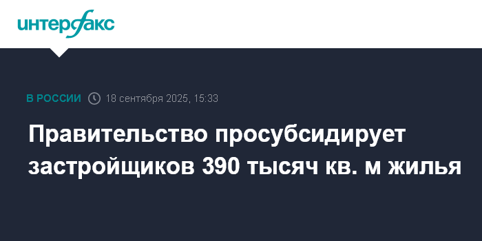 Москва. 18 сентября. INTERFAX.RU - Льготное кредитование для проектного финансирования получат застройщики 390 тысяч кв. м жилья со сроком сдачи в 2026 году, заявил на заседании с вице-премьерами глава правительства Михаил Мишустин.