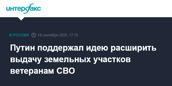Москва. 18 сентября. INTERFAX.RU - Президент РФ Владимир Путин поддержал идею безвозмездной выдачи гектара земли участникам СВО в ДНР, ЛНР, Запорожской и Херсонской областях.