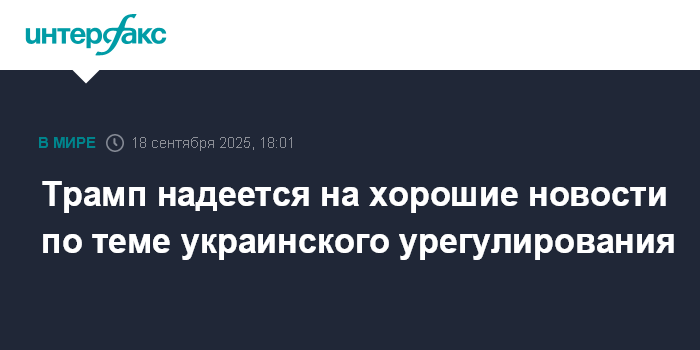 Москва. 18 сентября. INTERFAX.RU - Президент США Дональд Трамп, говоря в четверг об украинском урегулировании, заявил, что рассчитывает получить положительные сигналы в отношении решения этой проблемы.