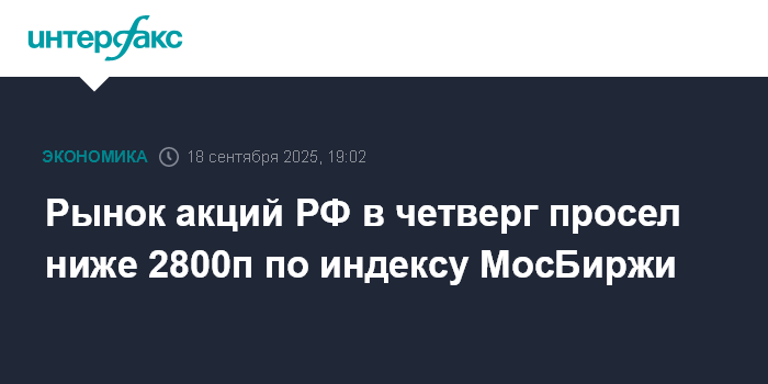 Москва. 18 сентября. INTERFAX.RU - Рынок акций РФ в четверг снизился под давлением продаж в ожидании санкционных новостей и на фоне сохраняющейся геополитической напряженности и неопределенности с процессом урегулирования украинского конфликта. Индекс МосБиржи опустился ниже 2800 пунктов после утренних попыток подрасти на позитивных данных Росстата по инфляции; лидерами отката выступили бумаги МКБ (-4,7%), ПАО "ФСК-Россети" (-3,3%) и "Сургутнефтегаза" (-2,8%).