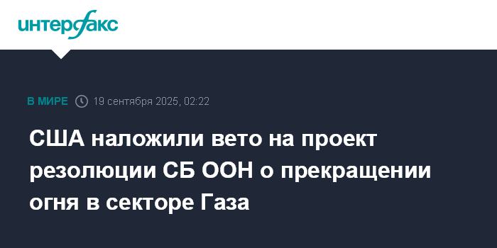 Москва. 19 сентября. INTERFAX.RU - США в очередной раз наложили вето на резолюцию Совета Безопасности ООН, требующую немедленного и постоянного прекращения огня в Газе и освобождения заложников.