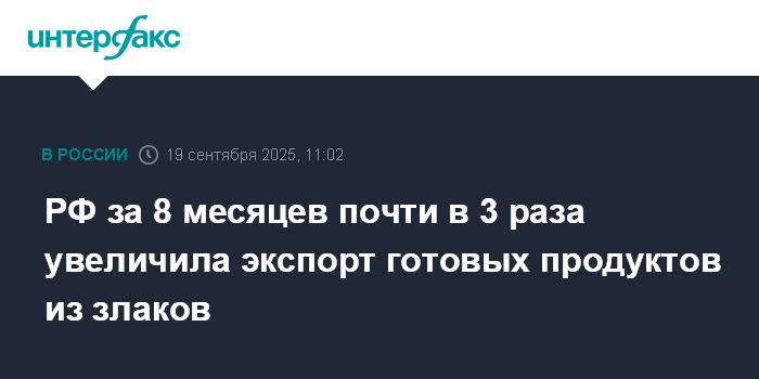 РФ за 8 месяцев почти в 3 раза увеличила экспорт готовых продуктов из злаков