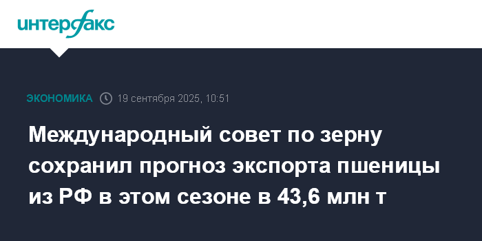 Москва. 19 сентября. INTERFAX.RU - Международный совет по зерну (МСЗ) в сентябрьском обзоре сохранил прогноз экспорта пшеницы из РФ в текущем сельхозгоду (июль 2025-июнь 2026 гг.) на уровне августа - 43,6 млн тонн.