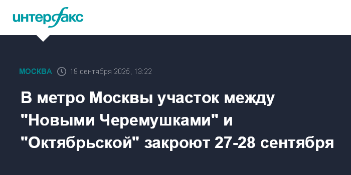 В метро Москвы участок между "Новыми Черемушками" и "Октябрьской" закроют 27-28 сентября